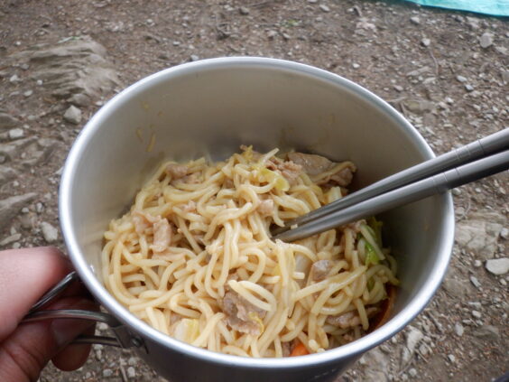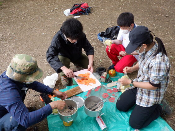 山頂にて。新入生に、恒例の焼きそばを作ってあげます。