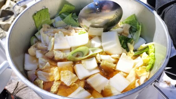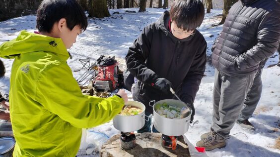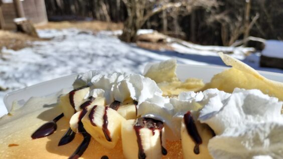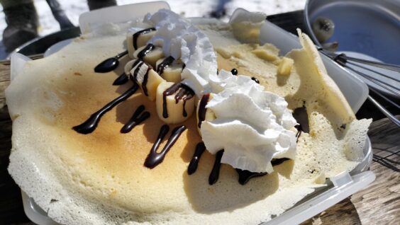 また、山頂で調理も行いました。今回はほうとうを作りました。人数が少なかったですが、手際よくでき美味しく食べることができました。また、指導員の方にバナナクレープを作っていただきおいしく食べられました。