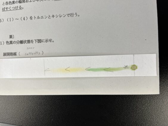 このシロツメクサの色素をろ紙に付け、有機溶媒に浸すことで色素を分離します。