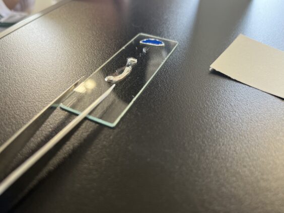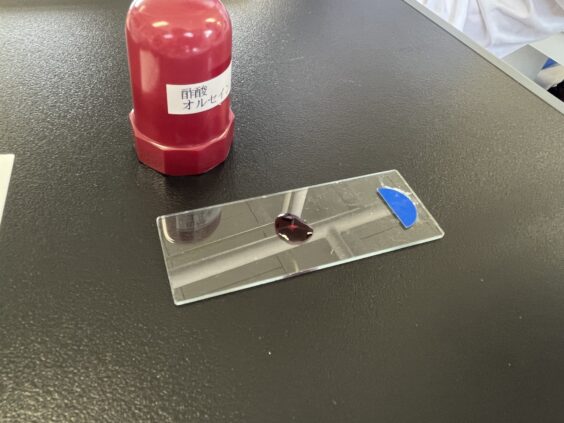 根の先端を1mm程度切り、その先端を酢酸オルセイン溶液で染色します。