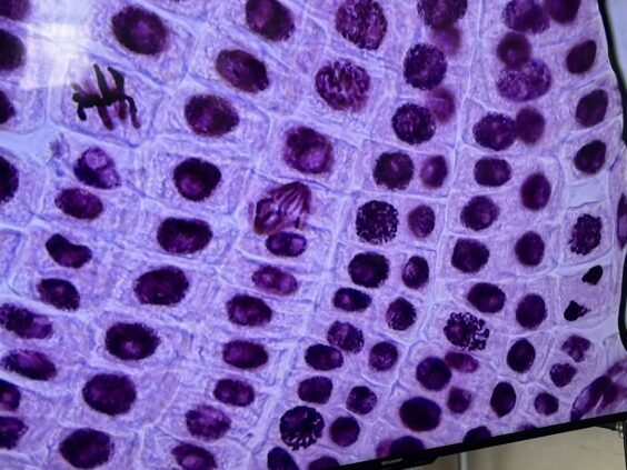核が丸くない細胞が分裂期の細胞です。分裂期には前期・中期・後期・終期の4つの時期があるんですが、それら全てを観察することができました。(上の写真に全て写ってます)
