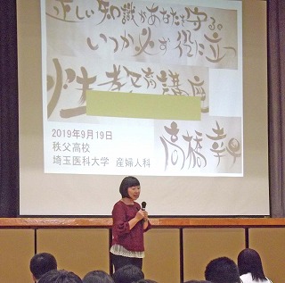 性教育講演会 2019.09.21学校行事 9月19日(木)、埼玉医科大学 医療人育成支援センタ―・地域医学推進センター 産婦人科助教の高橋幸子先生をお招きし開催しました。「正しい知識があなたを守る」をテーマにご講演をいただきました。