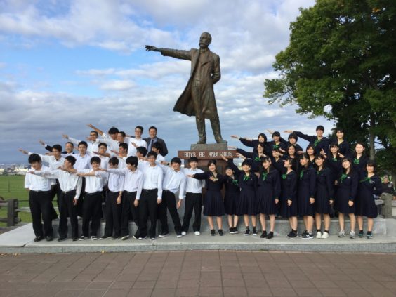 羊ヶ丘公園へ移動し、クラーク博士の銅像と一緒に集合写真を撮る。奥には札幌ドームが見える。