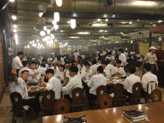 定刻通りに出発し、サッポロビール園にて夕食。生ジンギスカンの食べ放題。凄く旨い。本当に旨い。生徒によっては、一人一皿ずつ、ジンギスカン、おにぎり、野菜を食べたらしい。お腹がポッコリするほど食べた人、出発ギリギリまで食べ続けた人、とにかく沢山食べる。