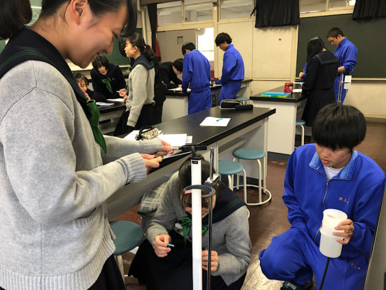 授業で学んだ知識を使いながら実験を進め,音叉の振動数を導き出すことができました。※化学実験もあった為,ジャージです(^^;