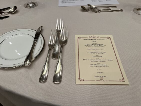 夕食は、『テーブルマナー講座』を行いました。講師の先生にマナーを教えてもらいながら、料理を楽しみました。どれも絶品でした♡