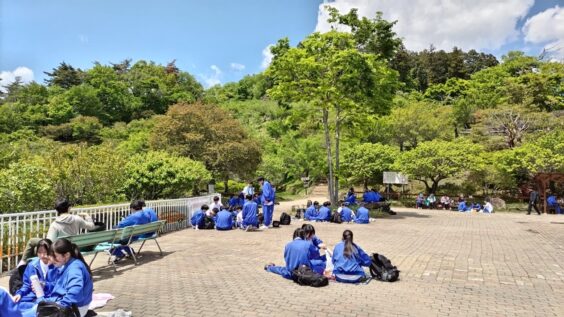 青空の下、新鮮な空気を味わい、クラスメイトらと語らい、