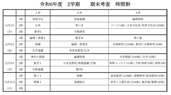 今回の期末考査の日程は12月5日(木)~10日(火)です。