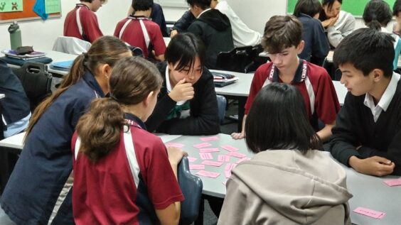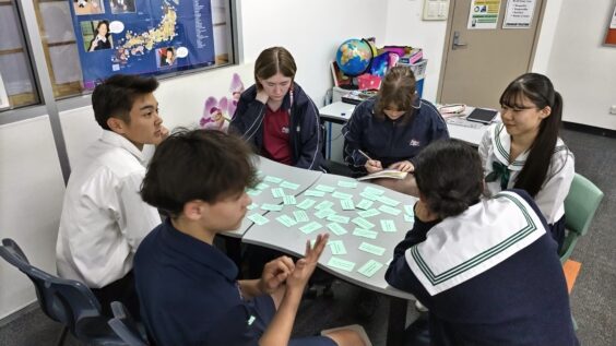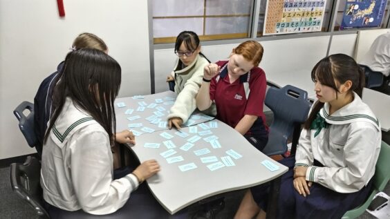英語と日本語が混ざったアクティビティ中心の授業で、