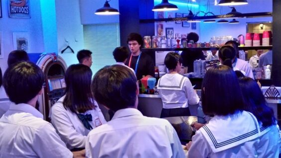 様々な英語でのコミュニケーションの方法について学ぶことが出来 ました。特に印象に残っているのは、 ファストフード店を模した場所で、 実際にハンバーガーなどをカスタマイズして注文をしたことです。 実際に海外のお店にいるような雰囲気で、 注文をする事が少し難しかったですが、とても楽しかったです。