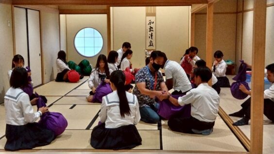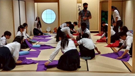 午前中は、日本の「おもてなし文化」について英語で学び、風呂敷の包み方・使い方を練習しました。今後、オーストラリアでのホストファミリー訪問時に実際に披露できるよう、全員真剣に取り組んでいました。