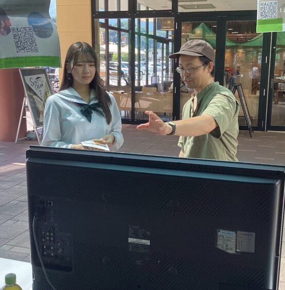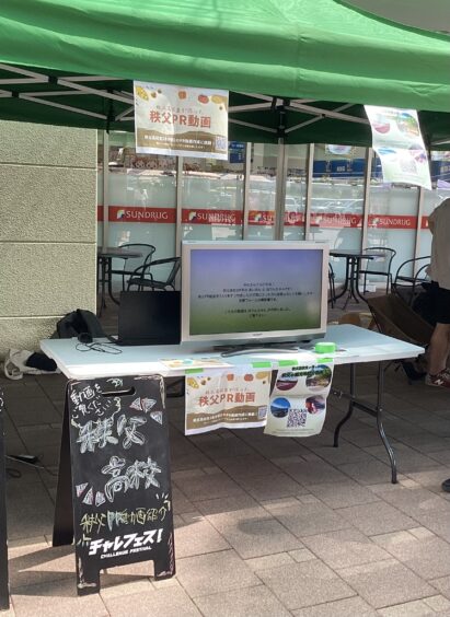 今回は、「探究ゼミ」で秩父をPRする動画を作成したチームがブースをお借りし、動画の放映と紹介を行いました。暑い中、足を止めて動画をご覧いただく方も多く、生徒たちが設置したGoogleフォームでのアンケートにもご回答いただきました。
